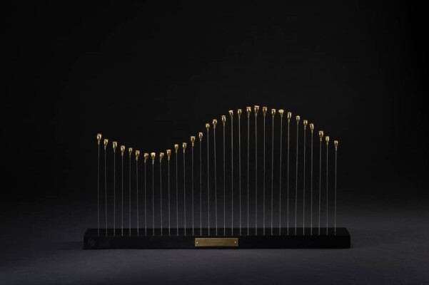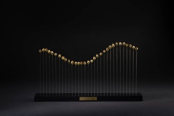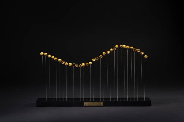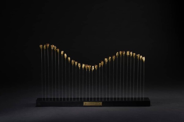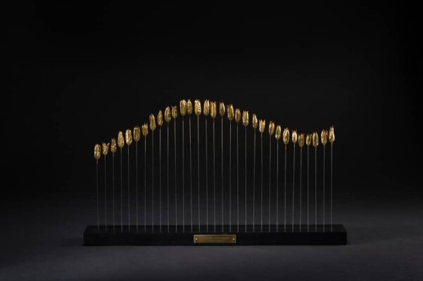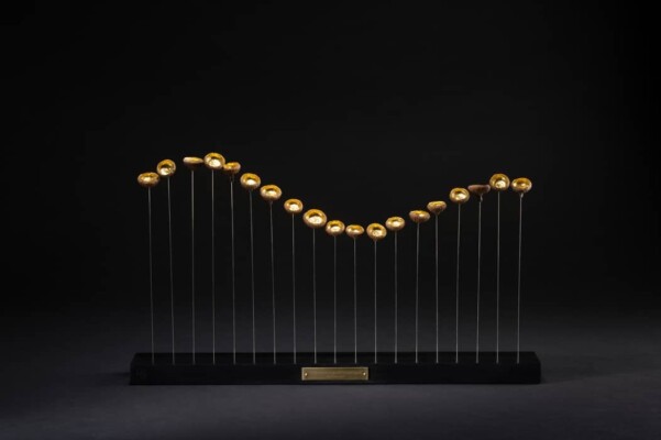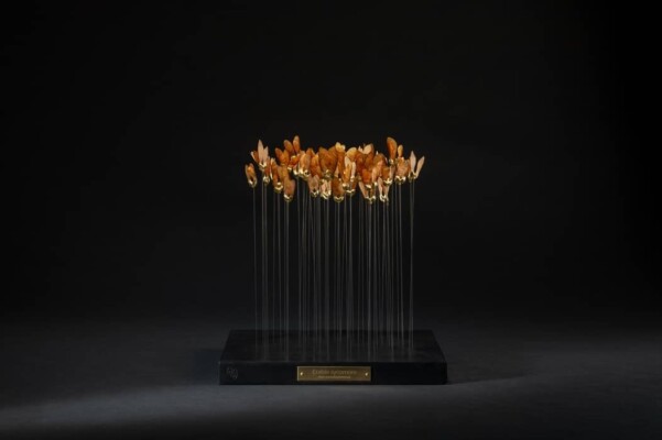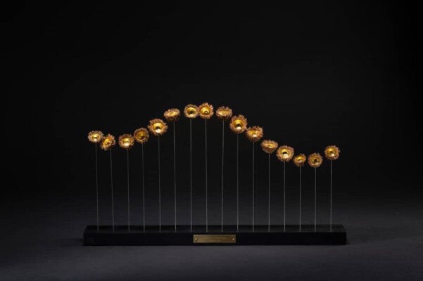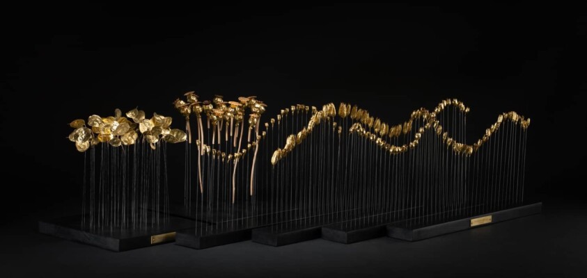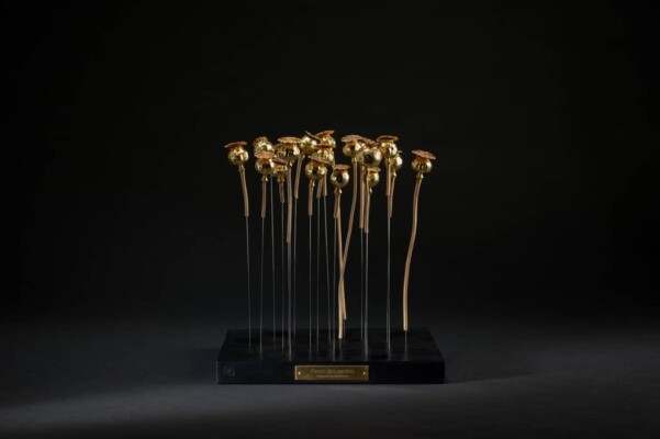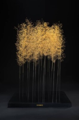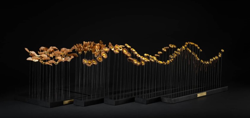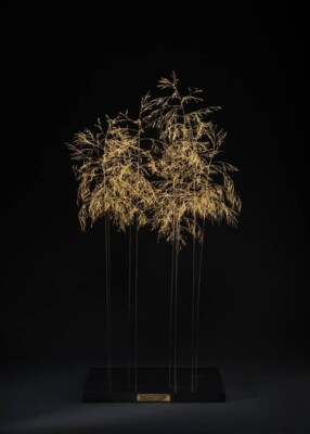 Au centre de cette installation, une forêt suspendue de graminées : elle semble receler des secrets, nous appelle, nous incite à y plonger, si ce n’est la main, du moins le regard et l’âme.